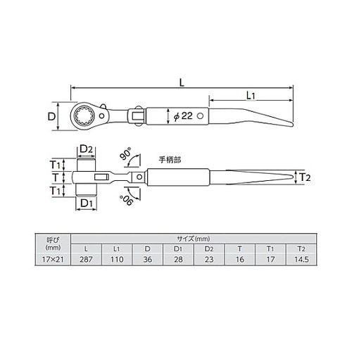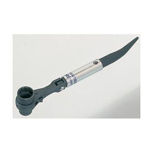 12ポイント左右切替式曲がりシノ付ハンドルがワンタッチで折れ曲りボルト・ナットの早回しができます。足場用クランプの組立、解体に適しています。 |
