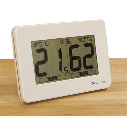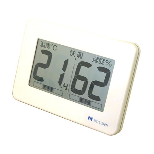 温度と湿度のみのシンプル表示です。大型液晶画面(165×95mm)の為、視認性に大変優れます。快適表示付きです。壁掛け、卓上療養で使用できます。 |