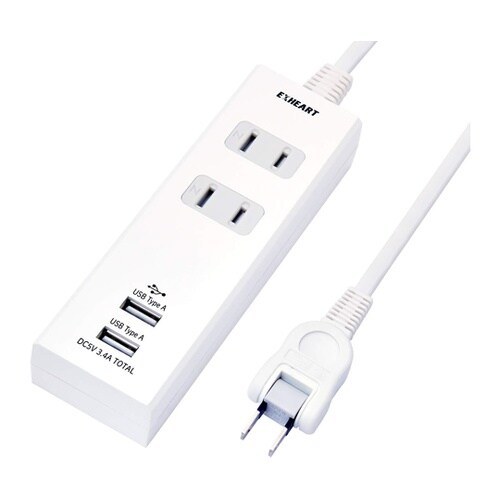 AC電源×2、USB−A×2のついたAC電源タップ5mです。USBポートは2ポート合計3.4Aの高出力だからタブレットとスマートフォンの同時充電も可能。 |