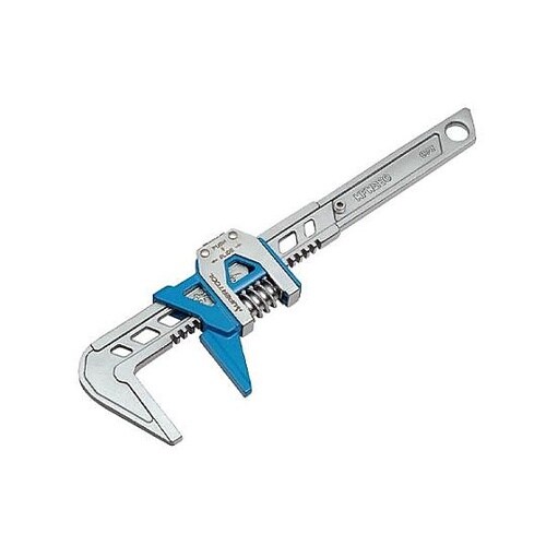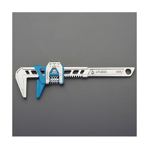 ワンプッシュ早送り機構でスピーディな操作です。モンキーレンチに比べて、口開きが大きく用途が広範囲です。めっきしたナットや銅・真鍮・鉋金など軟質のナット類の締付けに適しています。 |