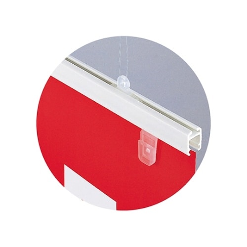 ポップ紙を引き下げ、交換しやすい位置でストップ。交換後ロックを外せば自動的に上がっていく仕組みです。簡単にポップ紙の高さを均一にすることができ、高い所のポップの交換がラクに行えます。 |