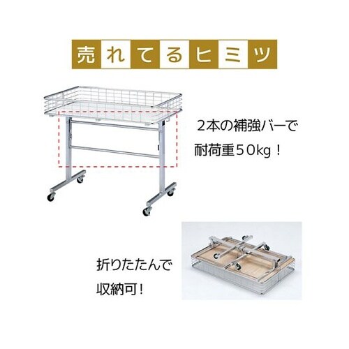 セールや店頭陳列に大活躍の業務用ワゴン什器。低価格ながら2本の補強棒で耐荷重50kgを実現。折りたためるので、使用しないときは省スペースにできるのも魅力。 |