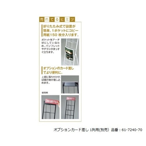 上部パネル追加前垂れ防止設計で機能アップ!!折りたたみ式で設置が簡単。1ポケットにコピー用紙150枚分入ります。ポケットをアーチ状にしているため、パンフレットやチラシがまっすぐ立ちます。 |