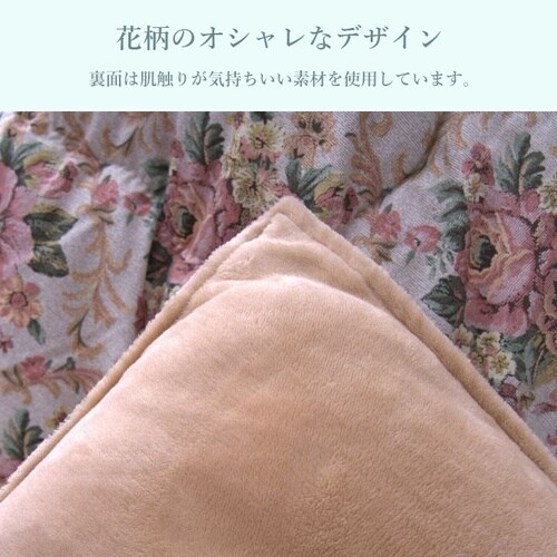 花柄のオシャレなデザインのこたつ布団。裏面は肌触りが気持ちいい素材を使用しています。保温性がある中綿を使用しているので、暖かいです。