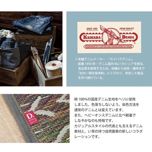 広島県のデニム生地メーカーとコラボしたい草ラグです。デニムの生地をヘリに使用しました。カラフルない草とデニムは相性ばっちりです。裏にはウレタンフォームでほどよいクッション性もあります。 |