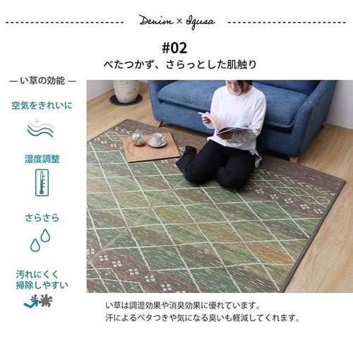 カラー:グリーン | サイズ:191×250cm | 主材質:表地=い草 裏表地=ウレタンフォーム6mm ヘリ=綿100% | 単位:1枚