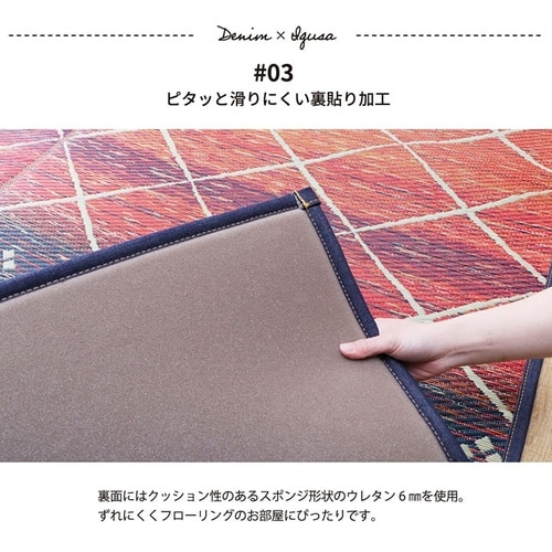 広島県のデニム生地メーカーとコラボしたい草ラグです。デニムの生地をヘリに使用しました。カラフルない草とデニムは相性ばっちりです。裏にはウレタンフォームでほどよいクッション性もあります。
