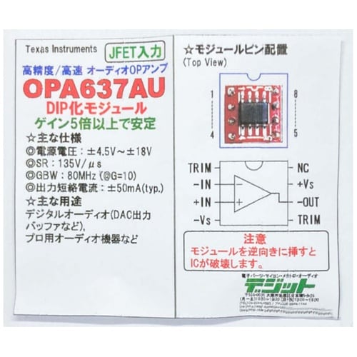 Texas Instruments製 オーディオ用オペアンプ「OPA637AU」を変換基板に実装、DIP8ピン形状に変換しました。 |