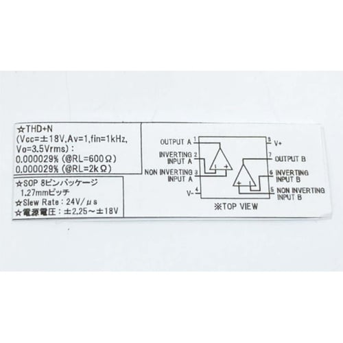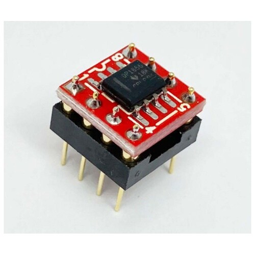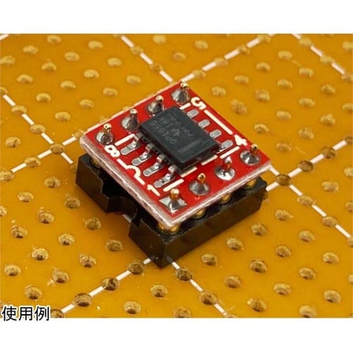 Texas Instruments製 オーディオ用2回路オペアンプ「OPA1656ID」を、変換基板に実装してDIP8ピン形状に変換しました。 |
