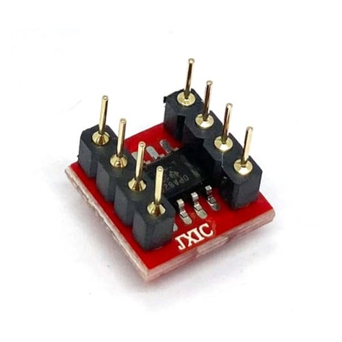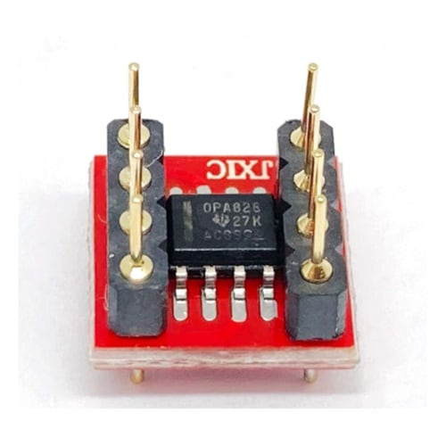 Texas Instruments製 オーディオ用オペアンプ「OPA828ID」(表面実装タイプ) 2個を変換基板に実装し、デュアルオペアンプ互換のDIP8ピン形状に変換しました。 |