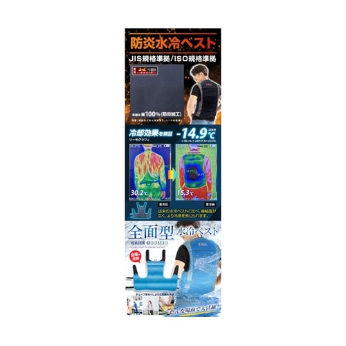 表面は綿100%防炎加工。JIS規格準拠、ISO規格準拠の防炎素材です。従来タイプの水冷ベストから進化。チューブをなくし、より広範囲に冷水が循環する水冷ベストに生まれ変わりました。 |
