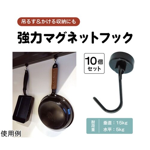 壁掛け収納等に便利な強力マグネットフックです。最大耐荷重は約15kgでキッチン周りやデスク周りの収納に便利です。(取付環境により異なります。 |
