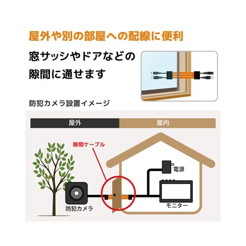 防犯カメラを屋外に設置したいとき、壁に穴を開けることなく、アルミサッシドアなどの隙間に防犯カメラケーブルを通すことができます。 |