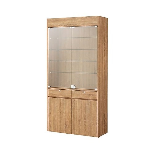 奥行35cmの木製ショーケース。ダウンライトが高級感を演出します!下部にはストックスペースもあるので、1台で展示・収納・販売まで行えます。 2ヶ所にダウンライトが埋め込まれています。 |