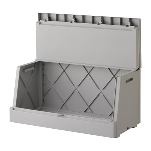 奥行45cmの薄型設計。屈まなくても蓋が開けやすく、蓋が二つ折りに開く。45Lゴミ袋2ー3袋を入れられる。園芸用品や18Lのポリタンクが4つ収納可能。 |