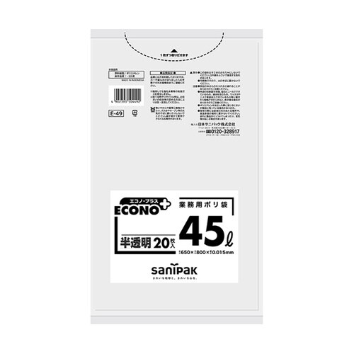 日本サニパック エコノプラス 45L 半透明 0.015mm 1ケース(20枚×15冊入) E−49 1ケース A09E-4896