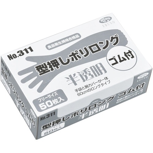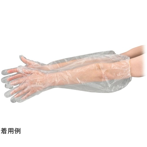 手袋と腕カバーが一体になった全長60cmのポリエチレン製手袋です。ゴム付きでズレを防ぎます。型押しエンボス加工でソフトな風合いです。 |