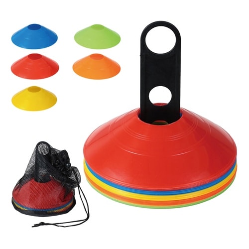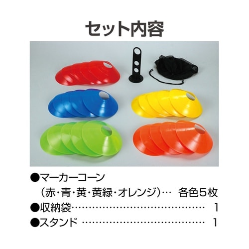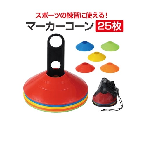 練習・誘導・区分けに!軽量&コンパクト収納のマーカーコーン!赤・青・黄・黄緑・オレンジの5色×各5枚、合計25枚入りのマーカーコーンセットです。 |