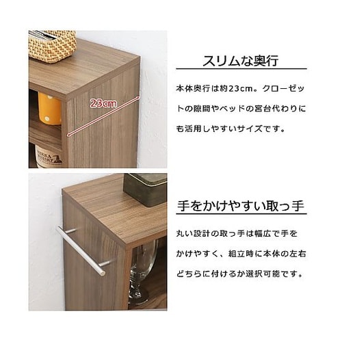 本体奥行き約23cmとスリムで、お部屋の圧迫感が軽減されます。テーブル脇のスペースやちょっとした隙間をご活用頂けます。棚板は4枚とも可動棚板です。 |