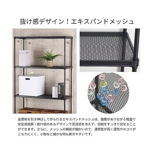 メッシュ棚で通気性抜群。通常のスチールラックにはないメッシュ仕様で、ホコリが溜まりにくく湿気もこもりにくい。キッチンや洗面所など水回りにも適しています。 |
