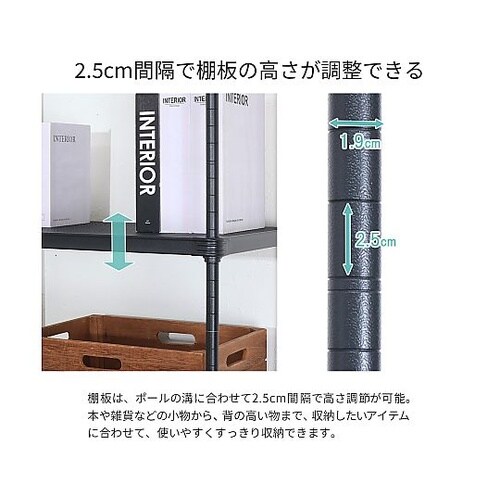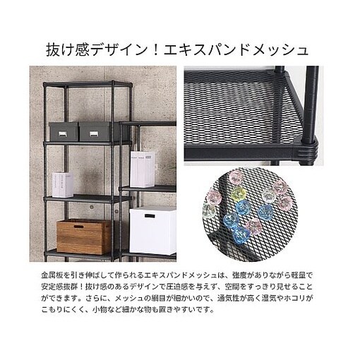 メッシュ棚で通気性抜群。通常のスチールラックにはないメッシュ仕様で、ホコリが溜まりにくく湿気もこもりにくい。キッチンや洗面所など水回りにも適しています。 |