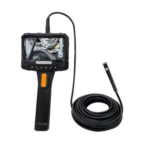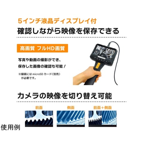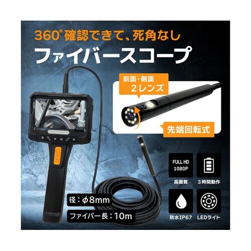 10mのファイバーケーブル先端とサイドのデュアルレンズカメラ。(カメラ2個)先端のサイドカメラ部分が約360°回転しながら撮影可能。5インチの液晶ディスプレイ付き。フル充電で約3時間連続稼働。 |