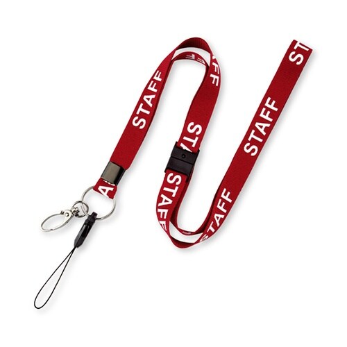STAFFと分かるストラップが登場。接客業、イベント、展示会、ボランティア、介護等のスタッフなどにお勧めです。ペンや名札用ケースが付けられます。強く引張ると安全装置が働き事故を防止します。