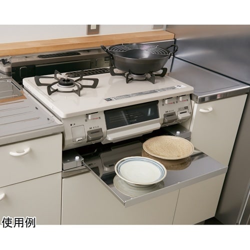 本品はガスコンロの下に取り付けて、鍋やお皿などを置くための補助テーブルです。使用しないときはスライドして収納します。幅59cmの標準サイズや幅56cmのコンパクトサイズのガスコンロに取りつけできます。 |