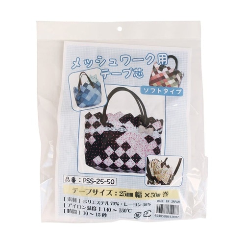 お好みの生地をテープ芯にアイロンで貼り付けて編みこんでいくとバッグや小物入れが作れます。ミシンで縫えるソフトタイプです。