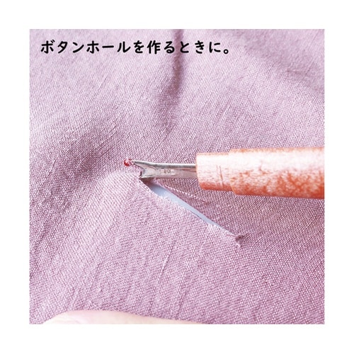 持ちやすく、扱いやすいサイズ感です。ボタンホールの切込みや、縫い目をほどく時に役立ち、糸をすくいやすく工夫された刃先もポイントです。 |