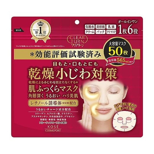 乾燥小じわ対策※マスク。1枚でスキンケアが完了する全顔用。気になる目もと・口もとを角層深くまでうるおいで満たします。大容量50枚分。※効能評価試験済み。 |
