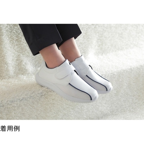 履き口が広く開き、着脱が簡単です。厚みのあるフロート状のソールが歩行時の衝撃を分散し、足・膝・腰の疲労軽減につなげます。サイドクールメッシュとクッションエアースルーインソールによりムレ感を抑えます。 |