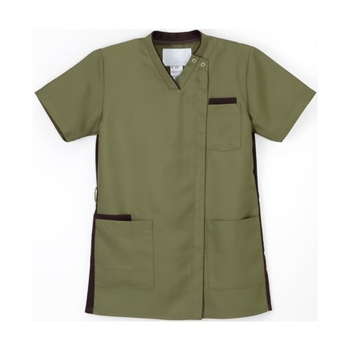 サイドファスナー開きの男女兼用スクラブです。バックスタイルの両サイドに配したニット素材が動きやすさと涼しさをご提供します。適度なゆとりのあるシルエットになっています。