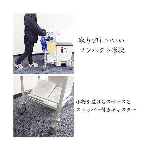 使用済みおむつの回収や新しいおむつへの交換に活用できます。使用済みおむつは前部のゴミ箱へ、新しいおむつは手前側の買い物かごより取り出しが可能です。
