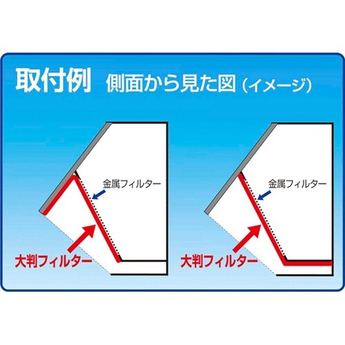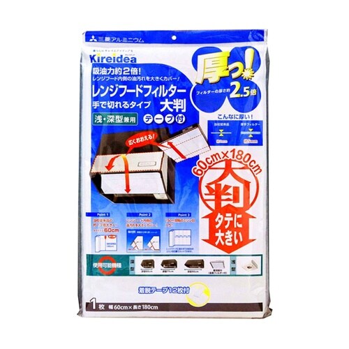 レンジフードの汚れを防ぐフィルターです。厚さはメーカー比2.5倍、吸油力は2倍の大判フィルターです。15cm間隔でミシン目が入っているので手で簡単にカットできます。 |