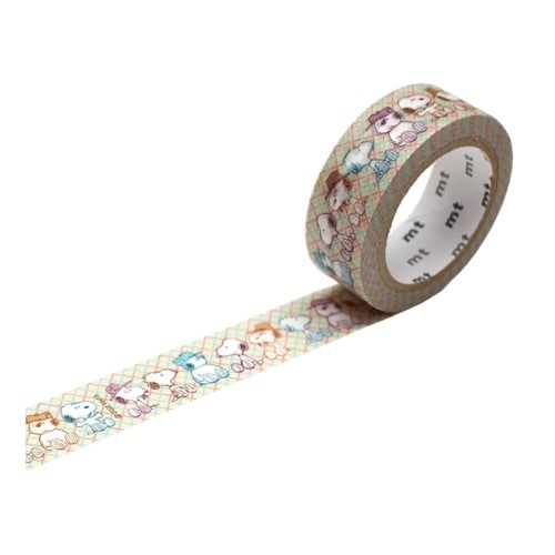 手でちぎって、貼って、はがせるmt(エムティー)シリーズのマスキングテープです。スヌーピーと仲間たちがちりばめられたかわいいデザインです。