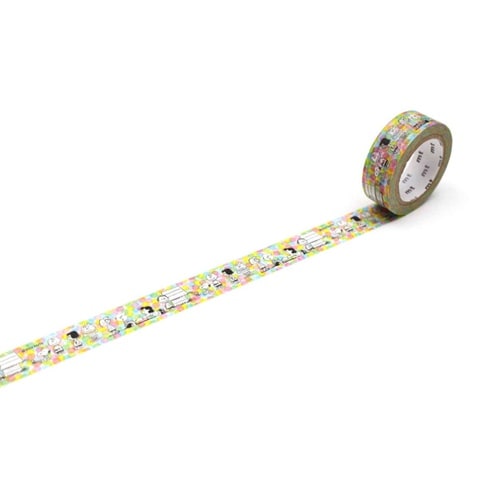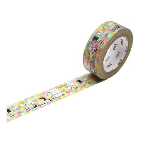 手でちぎって、貼って、はがせるmt(エムティー)シリーズのマスキングテープです。スヌーピーと仲間たちがちりばめられたかわいいデザインです。