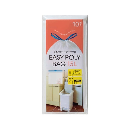 袋が簡単に結べるひも付きのポリ袋です。結び目のロスが少ないため、容量いっぱいに使用できます。収納袋や買い物など、色々な使い方ができます。キッチンなどの室内ゴミ箱にちょうどいい15Lです。 |