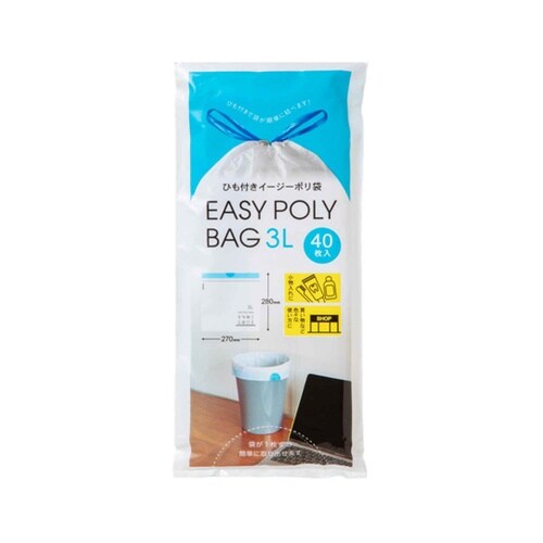 袋が簡単に結べるひも付きのポリ袋40枚入りです。結び目のロスが少ないため、容量いっぱいに使用できます。カサカサとした感触が特徴的です。引っ張りに強いです。収納袋や買い物など、色々な使い方ができます。 |