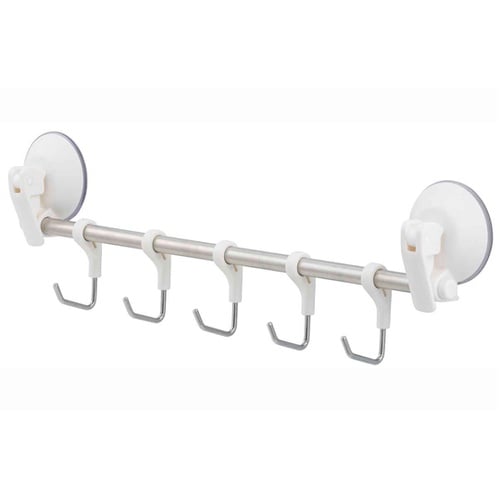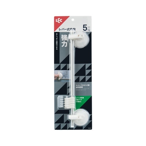 5つのフックが付いたレバー式吸盤フックです。レバーを下げて空気を抜くことで強力に吸着します。耐荷重は5kgです。 |