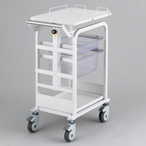 トレイを横スライドでき、すばやく取り出せる。ワゴン本体の総幅が410mmのスリム設計のため、回診時にストレスなく搬送できます。 |