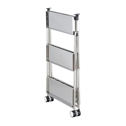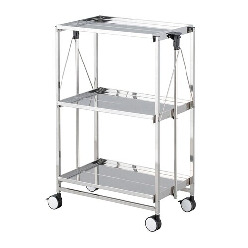 サイドレバーを押して上に引くだけで容易に折りたためます。ステンレス製で耐薬性・耐久性に優れています。天板には移動時に便利な片側ハンドル付きで、キャスターは走行性に優れています。 |