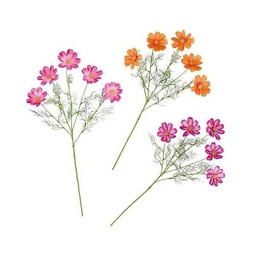 1本の茎から複数のお花が付いたデザインのスプレー。かわいいコスモスがおしゃれに秋を演出します。商品棚やレジカウンター、オフィスの受付など、花瓶に挿すだけで簡単に秋らしい店舗ディスプレイに。 |