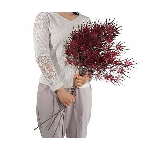 1本の茎から複数の葉が付いたデザインのスプレー。商品棚やレジカウンター、オフィスの受付など、花瓶に挿すだけで簡単に秋らしい店舗ディスプレイに。 |