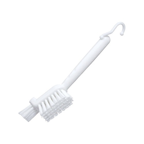 先端まで毛があり、普通のブラシでは届きにくい排水口や三角コーナーの角・底、細かな目の汚れをかき取ります。使用後はサッとかけて収納できます。 |