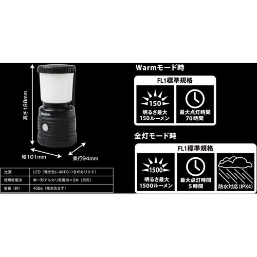 電源:単一形アルカリ乾電池×3個 | 明るさ最大:1500lm | 防水性能:IPX4 | 全灯光量:1500lm,点灯時間/5時間・COOL LED…