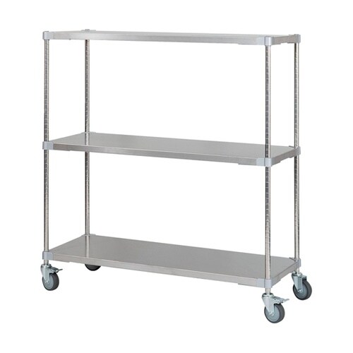 棚板・SUS304ステンレス、コーナー部・アルミダイキャスト(紛体塗装)、ポール・SUS304ステンレス、キャップ・ナイロン、アジャスター・SUS304ステンレス、テーパースリーブ・ABS樹脂、キャスター・スチール