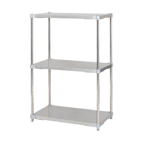 棚板・SUS304ステンレス、コーナー部・アルミダイキャスト(紛体塗装)、ポール・SUS304ステンレス、キャップ・ナイロン、アジャスター・SUS304ステンレス、テーパースリーブ・ABS樹脂