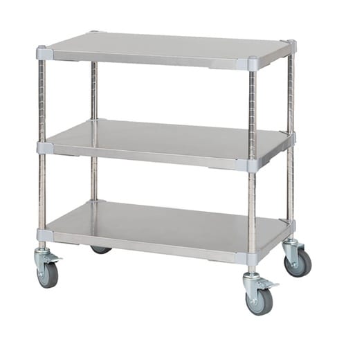 棚板・SUS304ステンレス、コーナー部・アルミダイキャスト(紛体塗装)、ポール・SUS304ステンレス、キャップ・ナイロン、アジャスター・SUS304ステンレス、テーパースリーブ・ABS樹脂、キャスター・スチール