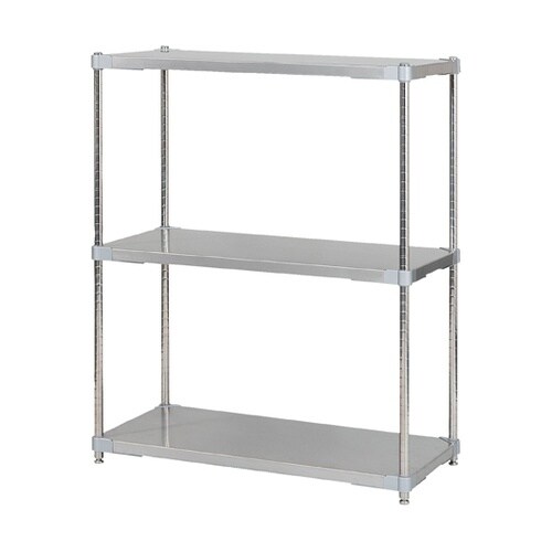 棚板・SUS304ステンレス、コーナー部・アルミダイキャスト(紛体塗装)、ポール・SUS304ステンレス、キャップ・ナイロン、アジャスター・SUS304ステンレス、テーパースリーブ・ABS樹脂